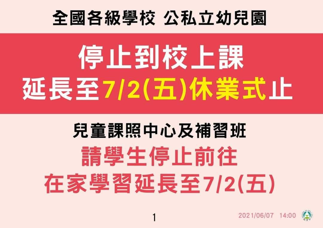 全國各級學校及公私立幼兒園停止到校上課延長至110年7月2日(五)止;兒童課後照顧服務中心、