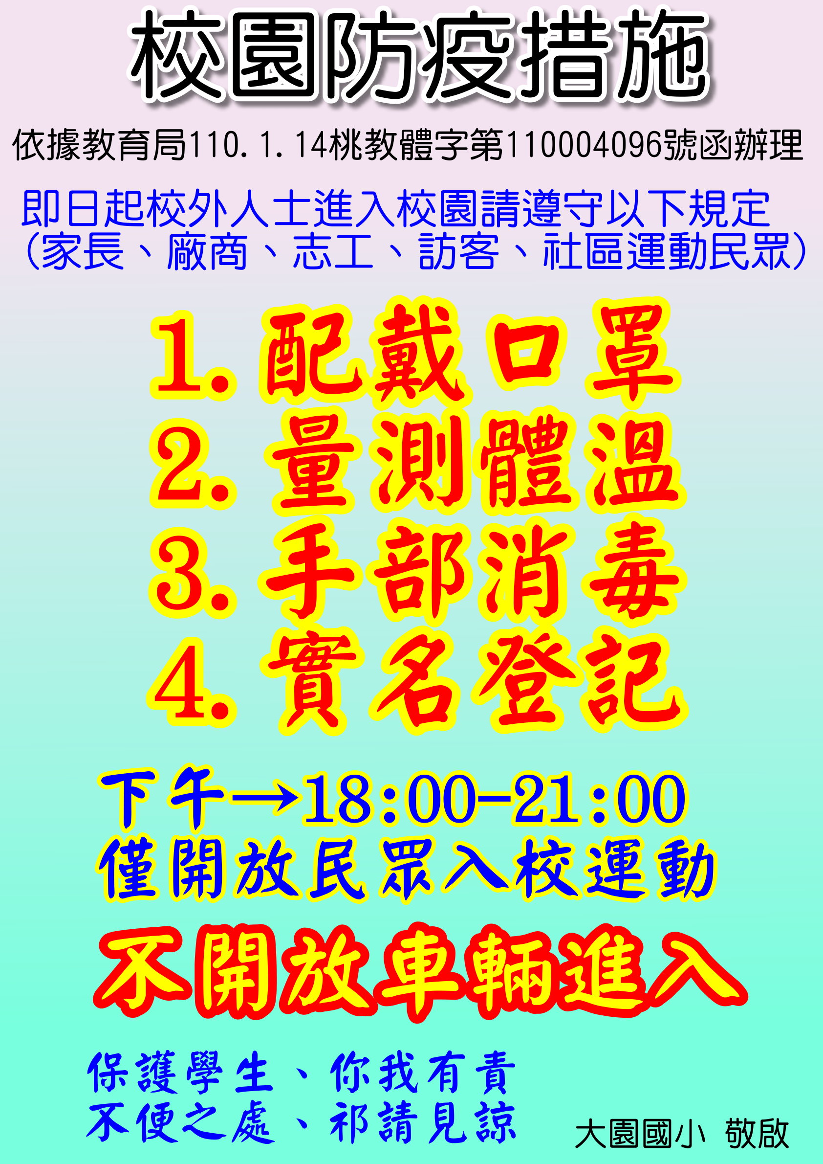 2.凡是進入校園的人士(含家長,廠商,志工,訪客及運動民眾),均須戴口罩,量體溫,手消毒及實名登記。