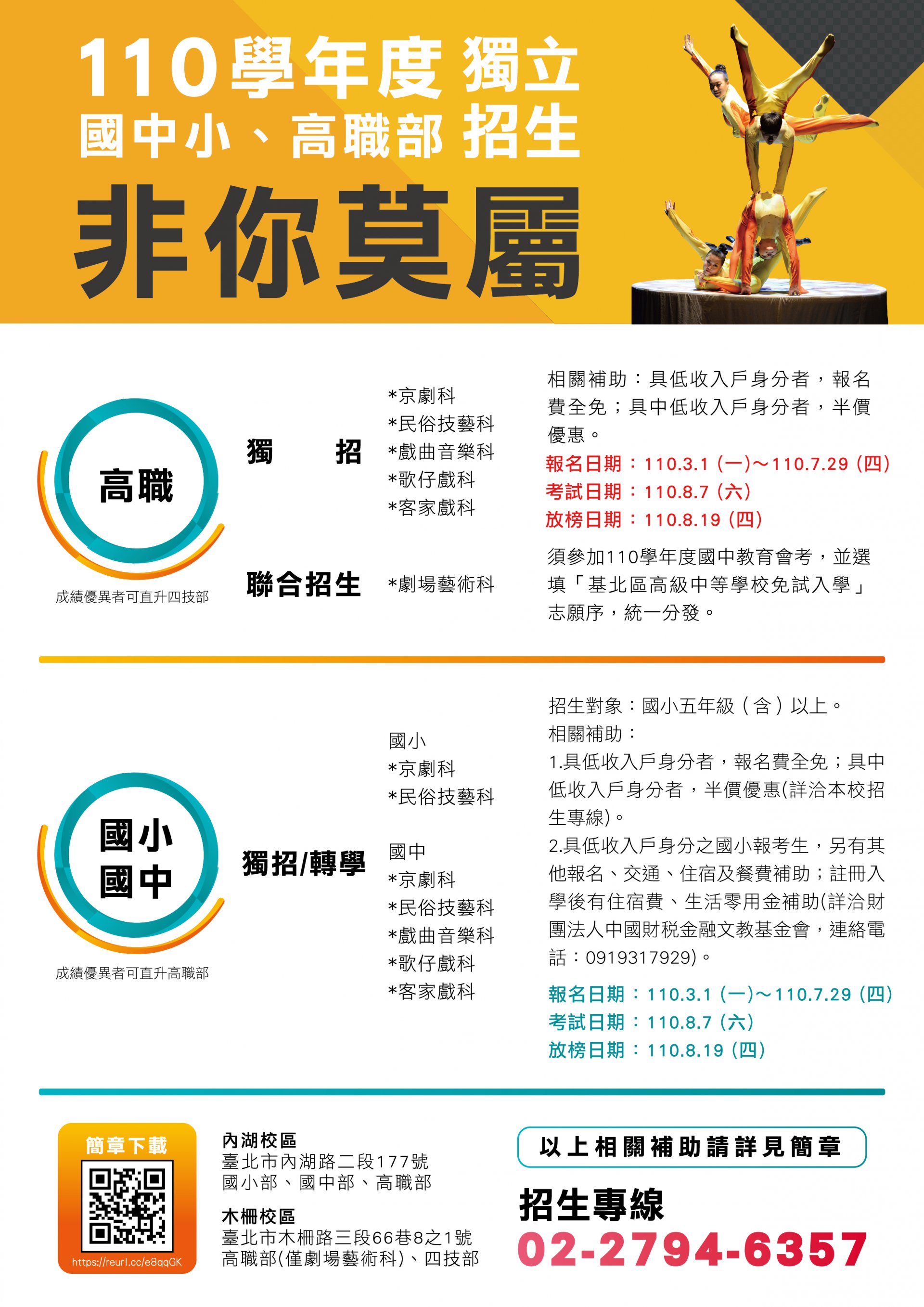 (三) 高職部轉學獨立招生:京劇科、民俗技藝科、戲曲音樂科、歌仔戲科、客家戲科,僅招收高職1年級學生。